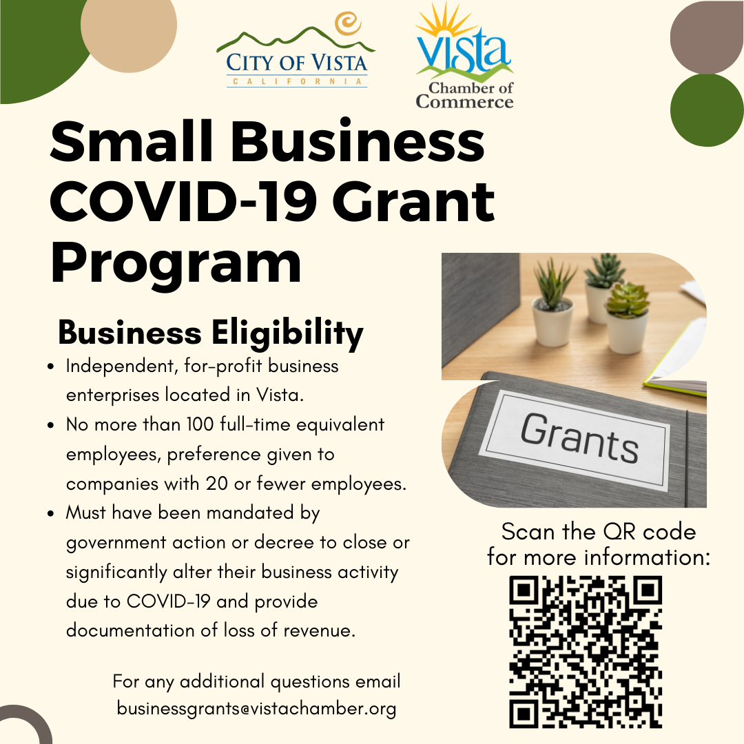 If your business suffered a loss of revenue due to the COVID-19 pandemic and you're located in Vista apply to receive up to $25,000 in grant money