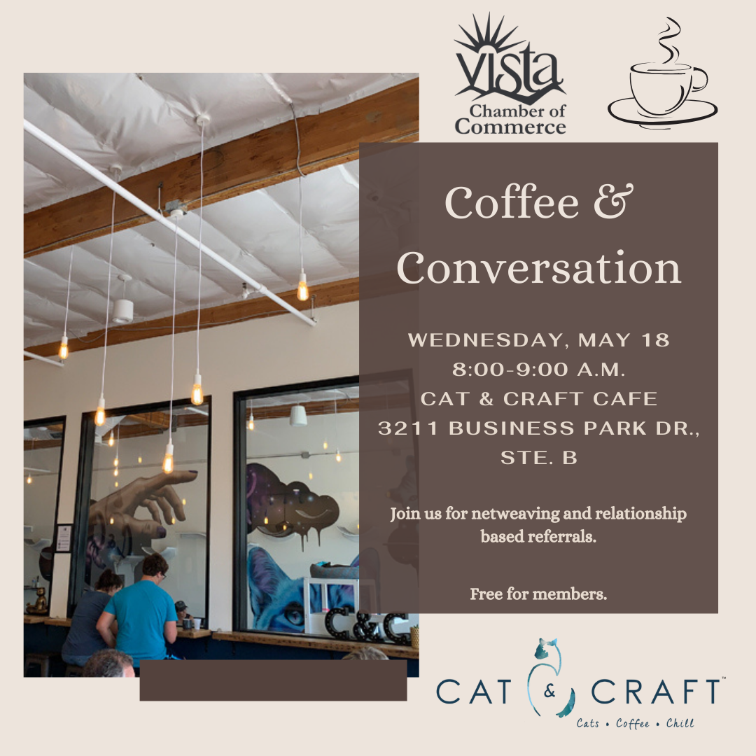 Join Vista Chamber CEO Rachel Beld for a morning coffee at Cat & Craft Cafe. Enjoy the coffee and pastries while netweaving and making relationship-based referrals with fellow Chamber members.