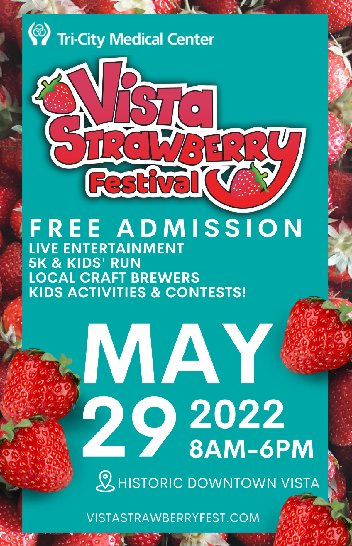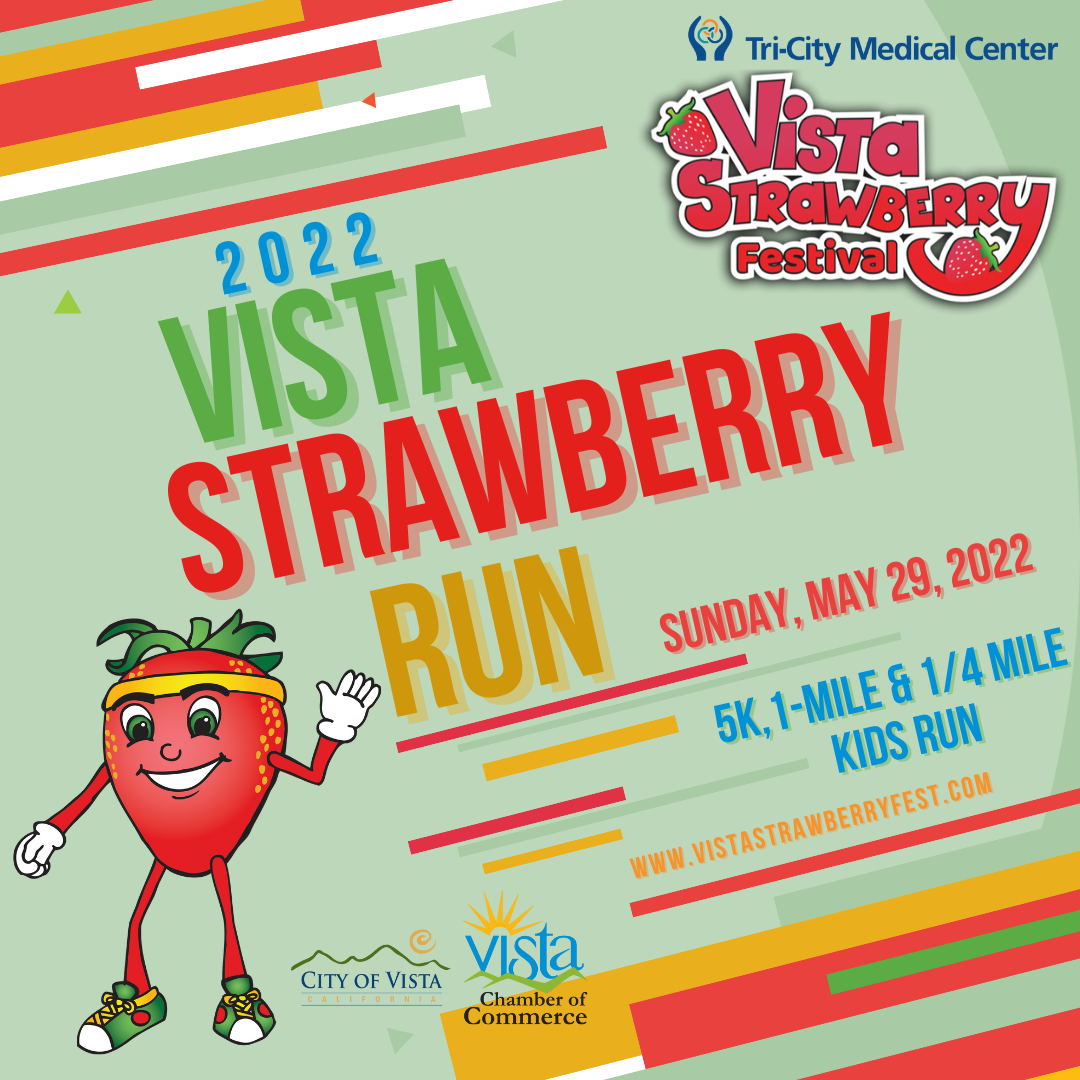 We also invite you to join us on the morning of the festival to take a tour of historic Downtown Vista on foot by running or walking the 2022 Vista Strawberry Run!