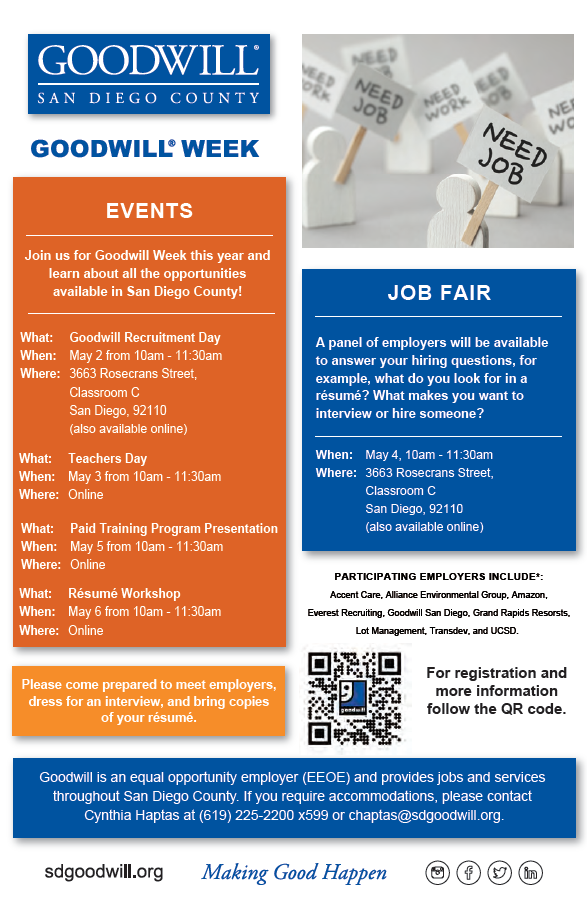 Get ready for the best summer ever! The City of Vista offers three distinctly different summer camp programs to keep your young camper entertained all summer long! Brengle Terrace Park Day Camps and Counselor-in-Training program June 13 - August 16, 2022 Campers enjoy many activities including arts and crafts, sports, science, hiking, water games, field trips, and more! | | | | | | Statewide Safer from Wildfires Townhall | Join California Insurance Commissioner Ricardo Lara, CAL FIRE and Local Fire Safe Councils for a Statewide Forum as we start Wildfire Awareness Month. Learn about how wildfire preparedness can help you with insurance. | | | Every year during the first full week of May, Goodwill San Diego and other Goodwill organizations across the United States and Canada celebrate Goodwill Week to highlight the defining principle of their mission. | | |