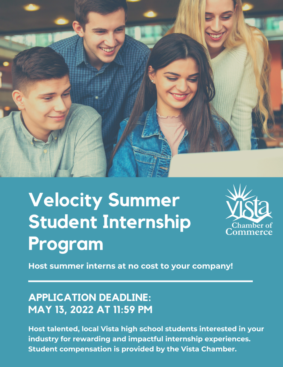 The Velocity Summer Student Internship Program is open to all Vista incoming high school seniors, graduating class of 2023.