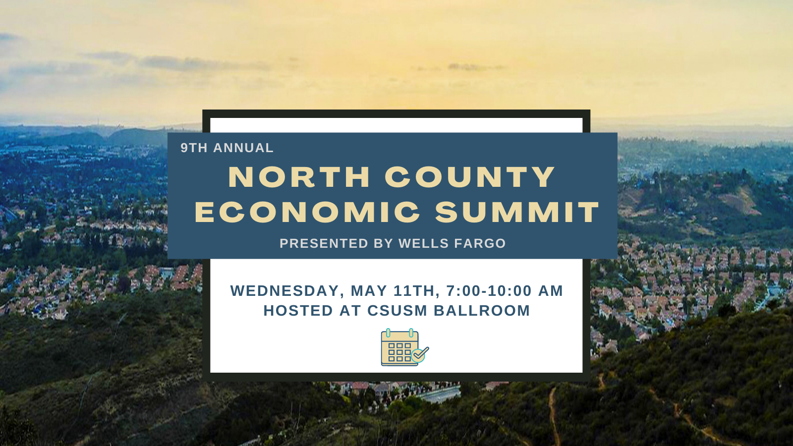 2022 North County Economic Summit | May 11, 2022 f rom 7:00 am - 10:00 am SDNEDC is proud to host the premier economic forecasting event in North County where we highlight national and local trends presented by Wells Fargo and BW Research. Join us for breakfast at the California State University San Marcos ballroom. | | | | | |