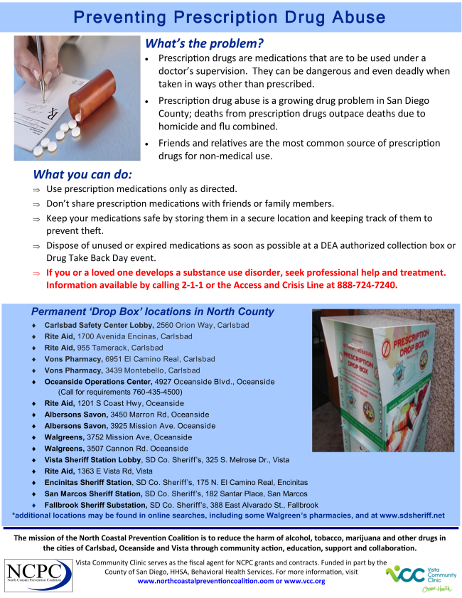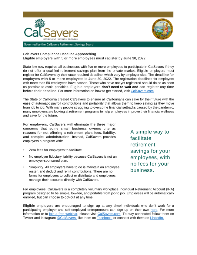| | | BUSINESS & COMMUNITY RESOURCES | | CalSavers Registration Deadline | Employers in California who employed an average of five or more employees must register with CalSavers by June 30, 2022 if they do not offer a qualified retirement plan. | | | Permanent Prescription Drop Boxes | Drop your old/expired prescription drug at one of the many permanent 'drop box' locations throughout North County. | | |