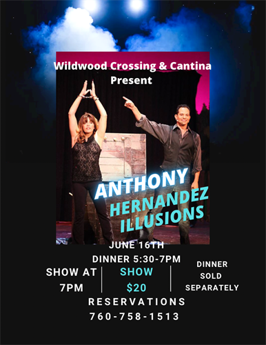 Enjoy dinner (sold separately) starting at 5:30 pm followed by the most amazing Magic Show by Magician Anthony Hernandez Illusions. Limited Tickets Available. Call for Reservations $20. Call 760-758-1513