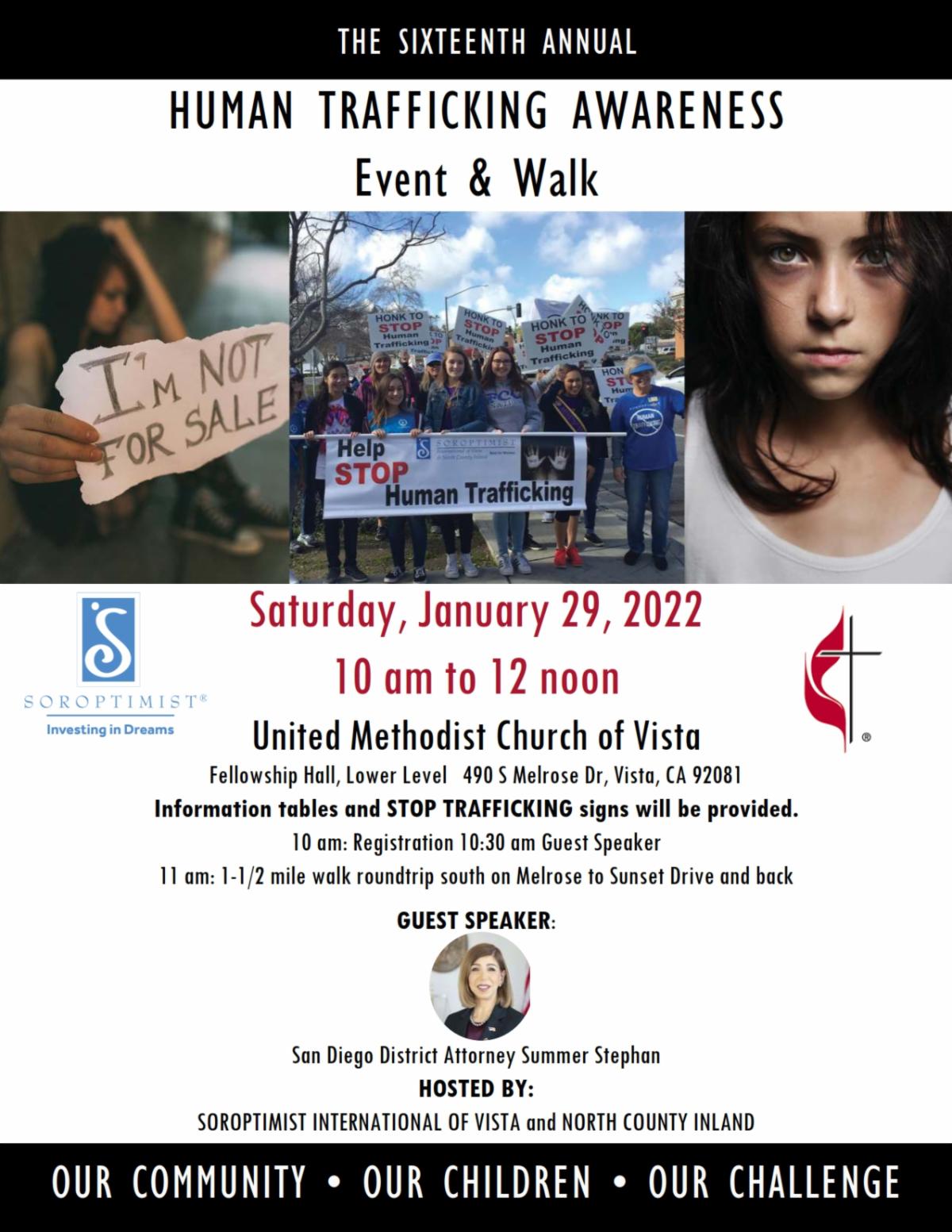 Please join Soroptimist International of Vista for their 16th Annual Human Trafficking Awareness Event & Walk.