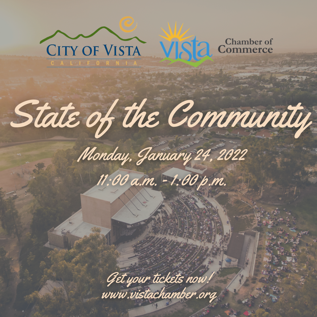 The State of the Community is back on January 24. Join us for this sit-down lunch and get updates from VUSD Superintendent Dr. Matt Doyle, Tri-City Medical Center Chief Medical Officer, Dr. Gene Ma; and Mayor Judy Ritter will share her final State of the City address. Don't miss it!