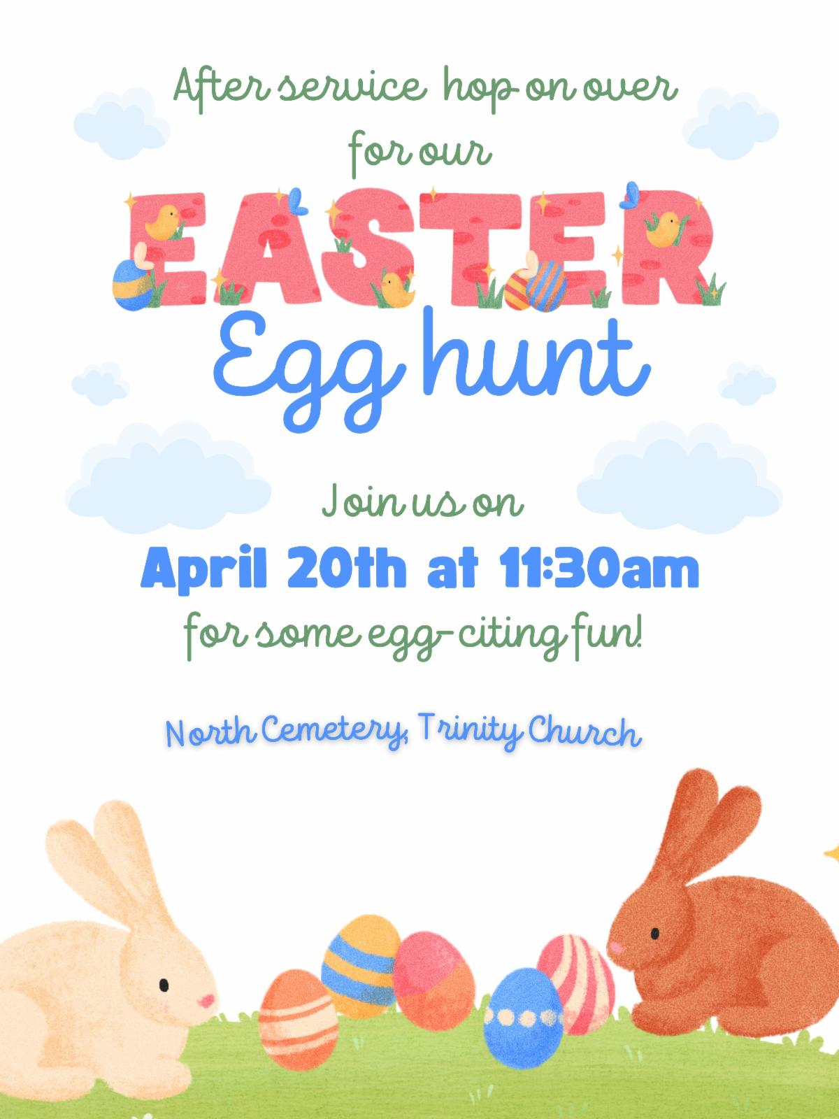 There will be no Sunday School on April 20, 2025. There will be an Easter Egg Hunt and Pansies to share with all who attend the 10:00 AM Service. Hospitality will be hosted by the Vestry. Please join us in fellowship to celebrate Spring and the resurrection of our Lord, Jesus Christ.