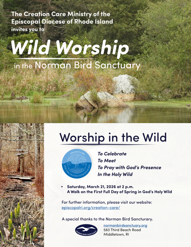 The Rev. Noel Bailey Robinson will lead a Wild Worship event at 2 p.m., Saturday, March 21, at the Norman Bird Sanctuary, Middletown. Wild Worship brings people together to experience the presence of God in the more-than-human-world around us, to pray, to sing and to reflect. All are welcome and there will be no charge for entering the grounds. Click here for more information on Wild Worship and the work of the Creation Care Ministry team.