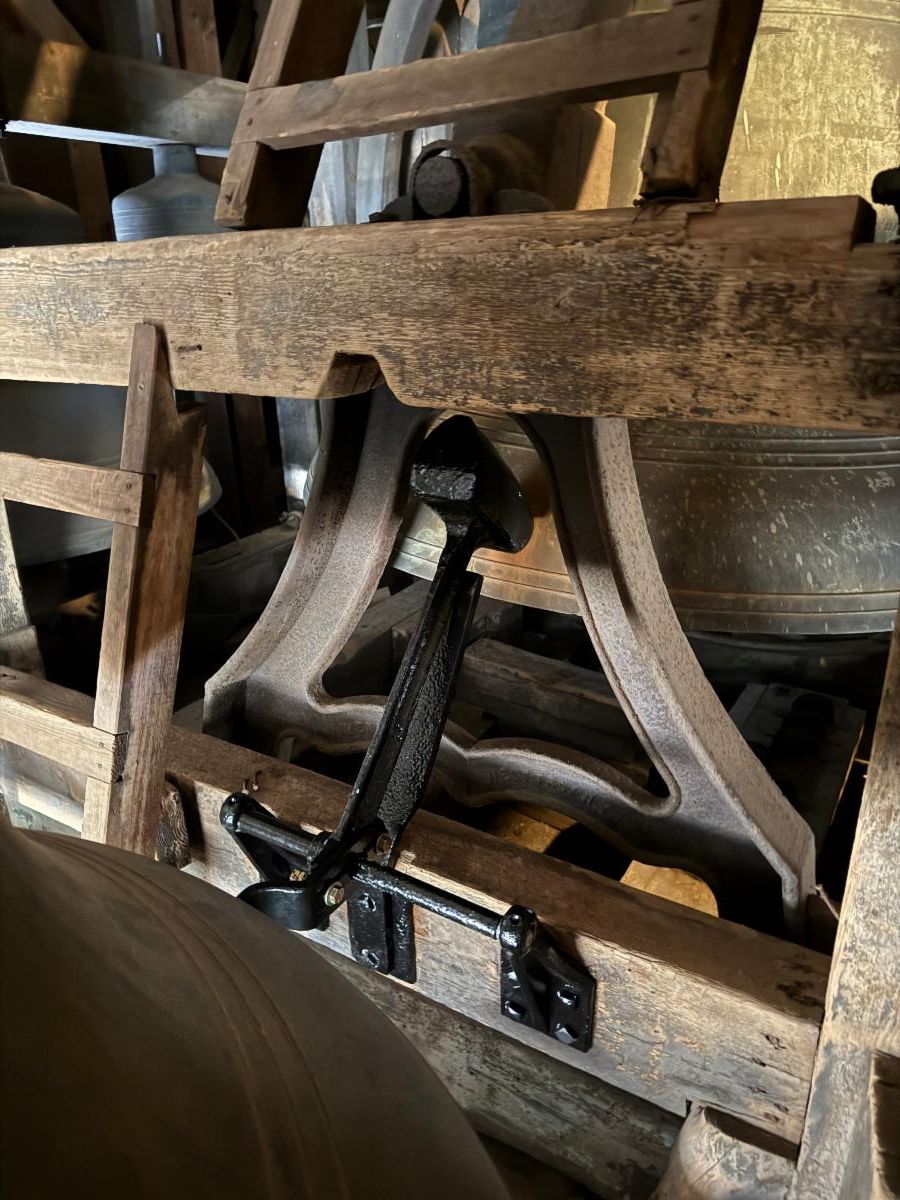 Earlier this week the “hammer” that chimes our bell at Trinity was returned to us after being taken away for a repair. It was sandblasted and painted, and the mechanism that moves the hammer was replaced so that it rings as it is meant to on the hour, every hour. You can see it in the photo, in position and ready to work.