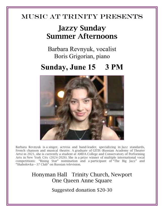 June 15th - 3 PM Jazzy Sunday Summer Afternoon with Barbara Revnyuk, Vocalist and Boris Grigorian, Piano. See poster.