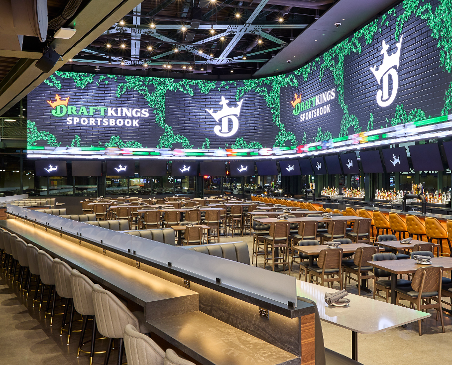 "A massive 2,000 square foot video wall may be the first thing you notice when you enter the DraftKings Sportsbook. The screen can be configured to show up to a couple dozen sporting events at one time, or just one. The video wall is ideal for an entertainment venue where DraftKings hopes the primary focus eventually will be on sports gambling" ( ABC 7 News reports).