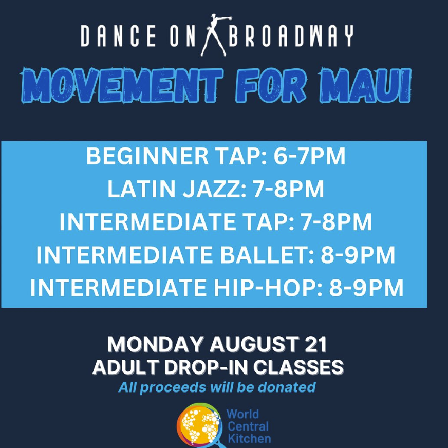 On Monday, August 21st, Dance on Broadway is hosting Movement For Maui. Join in for a night full of dancing to give back to those effected by the wildfire in Maui, HI. All proceeds from Mondays classes will be donated to The World Central Kitchen. WCK is first to the frontlines, providing fresh meals in response to humanitarian, climate, and community crises.