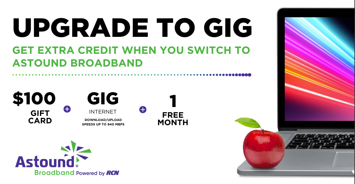 | | Enjoy back-to-school savings! 🍎✏ Get a $100 gift card, a 2-year price lock, free installation, and one month free when you upgrade to Gig Internet with Astound Broadband. No Hidden monthly fees, no contracts, and no data caps when you switch to our award-winning internet. Shop all of our new offers at astound.com | | |