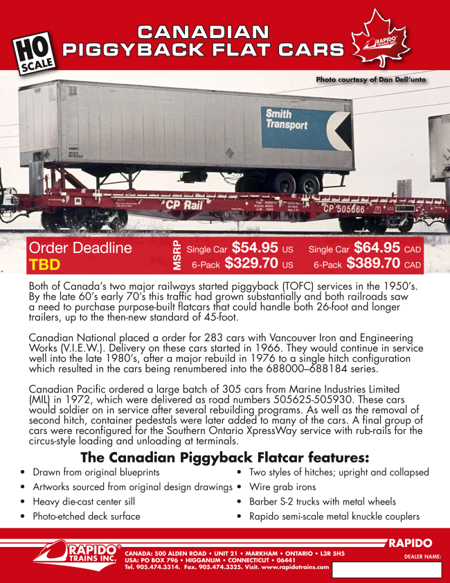 Rapido is proud to offer both these cars in HO Scale as our " Canadian Piggyback Flatcars!" ...as well as Canadian Trailers! After you read through this section (no early leavers, please read the whole flatcar section first!) check out the trailer section immediately following the flatcars.