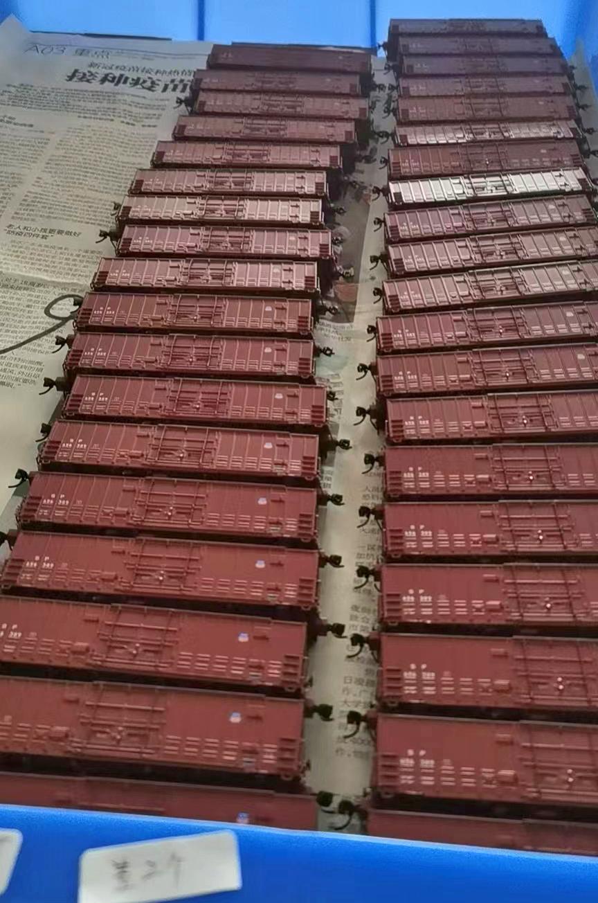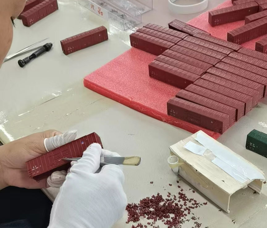 It's an RR-56 Reefer sighting! The roof is being QC checked, and then they will paint the insides of the cars gray before applying the lettering. |