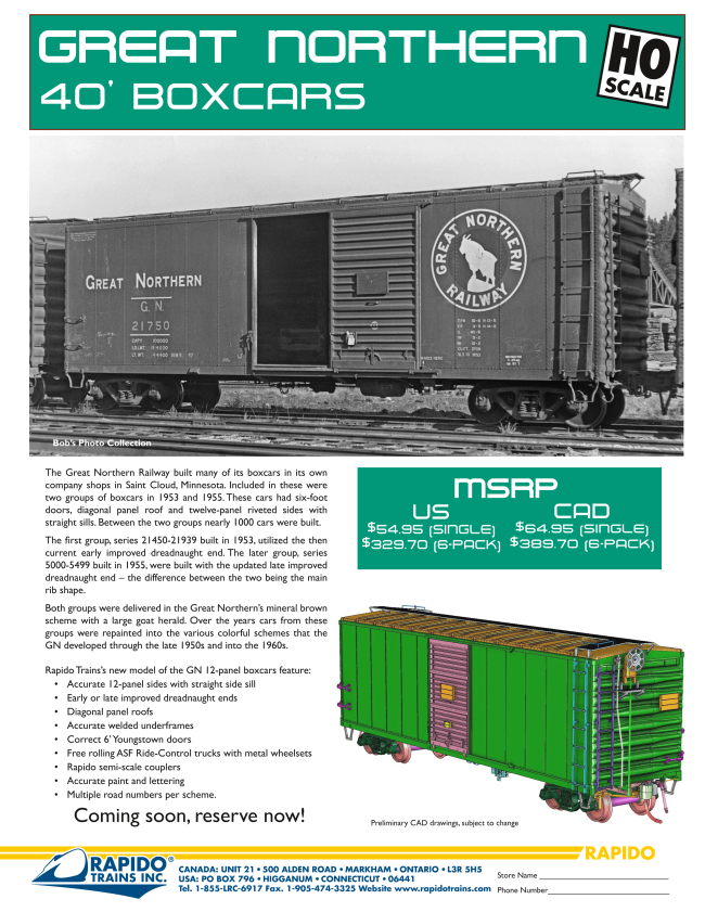 There you have it, a GN update! So, order those HO Scale GN Boxcars and we'll get you samples to look at in the meantime. |