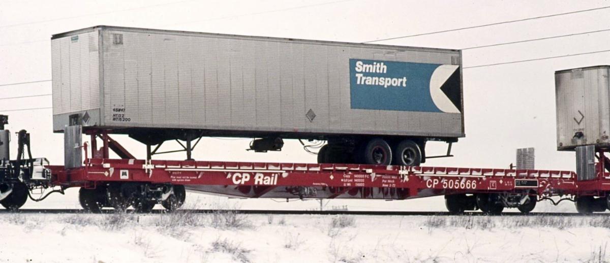 1950 saw lots of change. The first credit cards rolled out, the first non-stop trans-Canadian flight was made and CN and CP started running piggyback services. The movement of truck trailers on flatcars is often commonly referred to as "piggyback" and started out with 40' and 50' flatcars being utilized. By the 1960s and 70s, the earliest modes of intermodal were in full-swing. The demand to carry the unique-to-Canada 26' trailers as well as the common 45' trailers was evident. CN placed an order with Vancouver Iron and Engineering for 283 flatcars, while CP would order a group of 305 cars from Marine Industries.