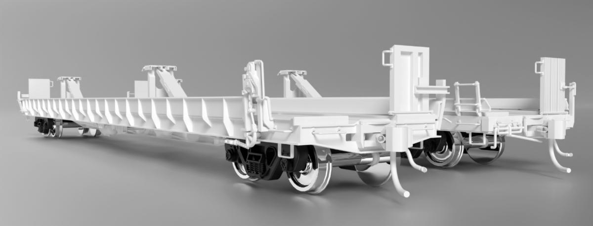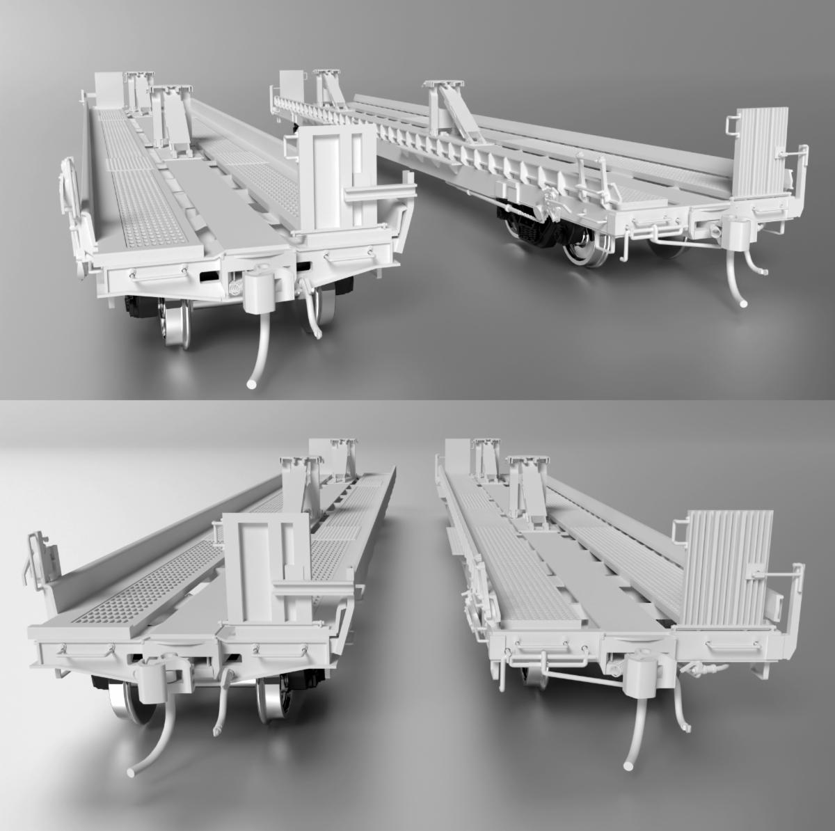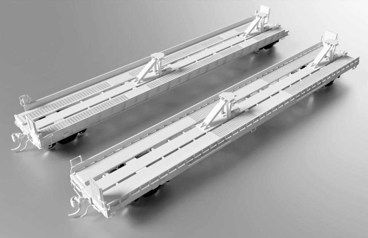 CN's cars were first constructed in 1966 and lasted well into the late 1980s, after a major overhaul in 1976 to single hitch configurations. We will offer BOTH of these versions, with the single hitch rebuilds coming at a later date. Check out some of the CN Piggyback Flatcar renders below! |
