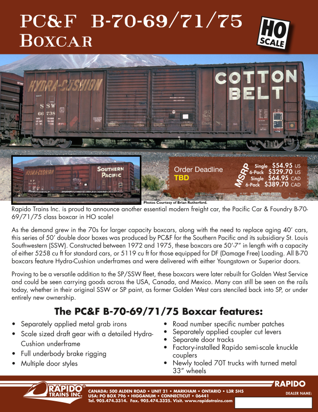 As the demand grew in the 70s for larger capacity boxcars, along with the need to replace aging 40’ cars, this series of 50’ double door boxes was produced by PC&F for the Southern Pacific and its subsidiary St. Louis Southwestern (Cotton Belt). Constructed between 1972 and 1975, these boxcars are 50'-7" in length with a capacity of either 5258 cu ft for standard cars, or 5119 cu ft for those equipped for DF (Damage Free) Loading. All B-70 boxcars feature Hydra-Cushion underframes and were delivered with either Youngstown or Superior doors. |