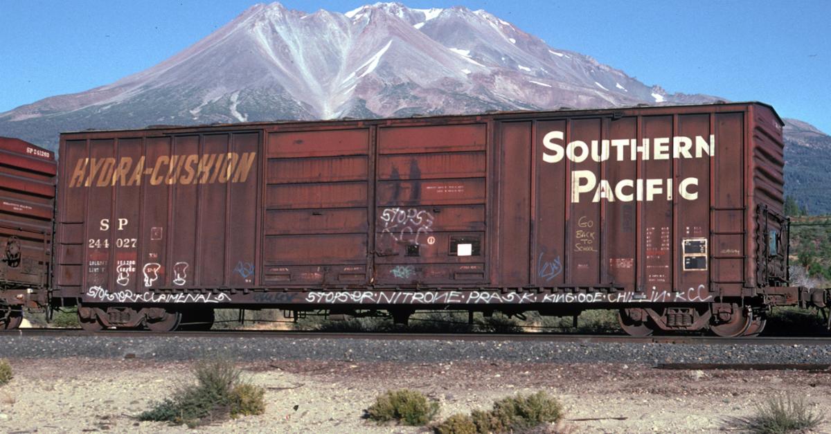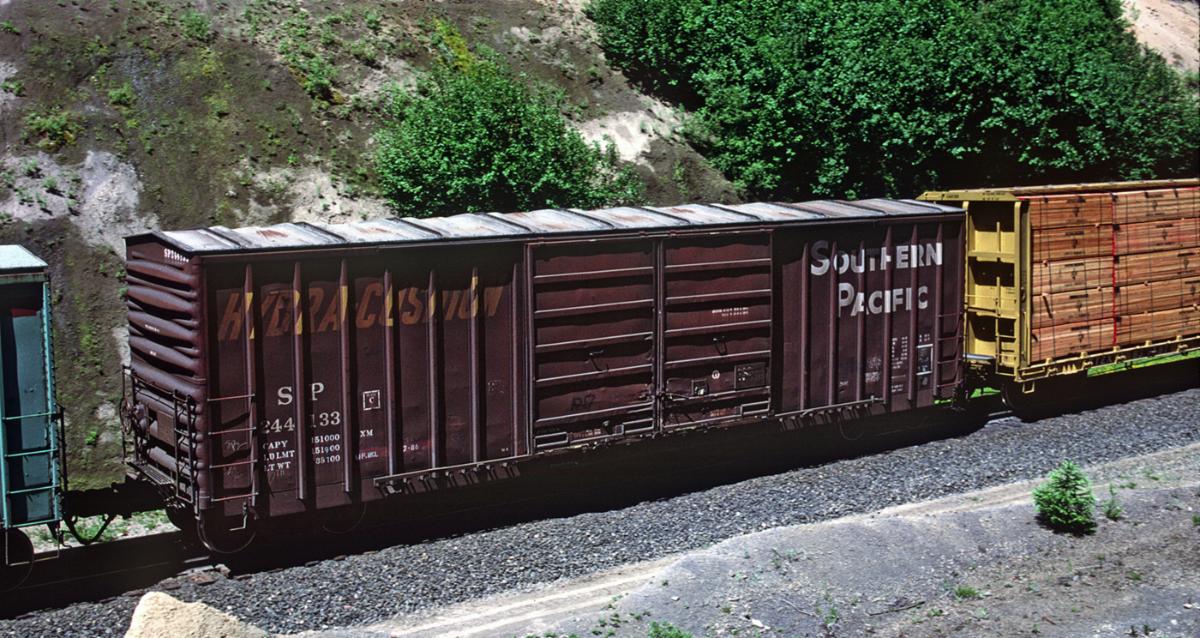 Does it get anymore Northwest than green mountains, SP boxcars and lumber? Photo courtesy of Brian Rutherford. |