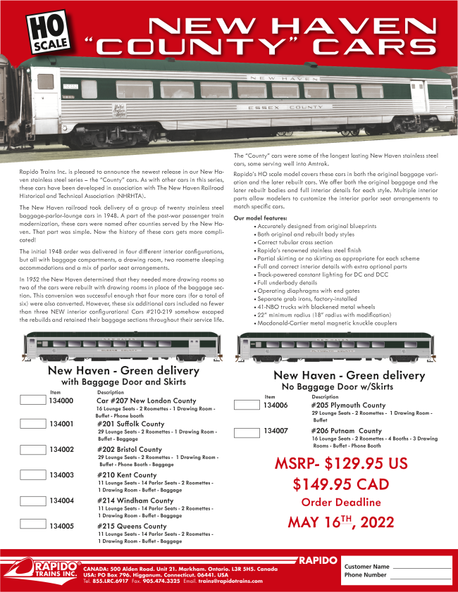 Here's your chance to get the HO Scale New Haven County Cars ordered. May 16th is the order deadline, so make sure you get all of your orders in by then. |
