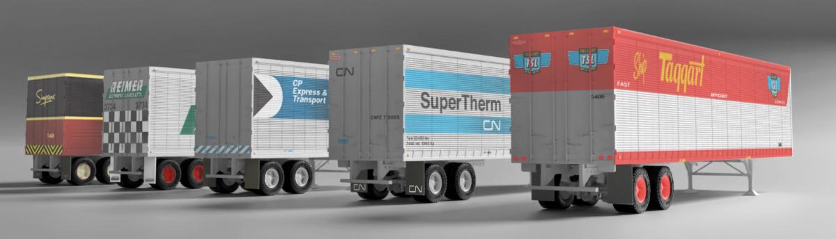 The two trailers are the 26’ Can-Car Industries Dry-Vans with and without side doors and the 45’ Trailmobile design trailers, also with and without side doors. The 26’ trailers were widely used by Canadian National and Canadian Pacific for package delivery services, as well as trucking services and retail store owners. These unique trailers have the iconic ribbed sides with catchy graphics. Eventually they were phased out of service in the 1980s. |