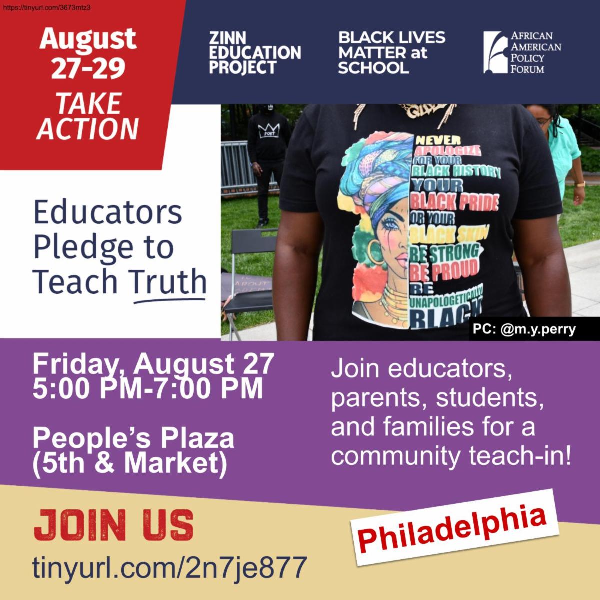 A teach-in at The President’s House – Protest Park. Hosted by #TeachTruth Philly. Come and join educators, parents, students, and families as we stand together to pledge to #TeachTruth by actually teaching the truth. In the style of SNCC and community teach-ins we welcome you to come and learn and explore.