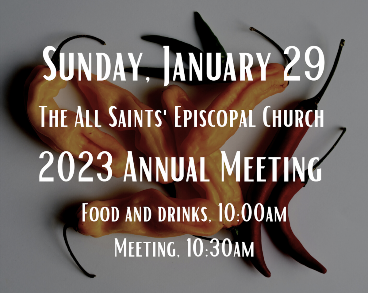 Annual Meetings at All Saints are joyous, festive affairs. Yes, we handle the business of the church—reviewing the past year, examining past financials, receiving the budget passed by vestry for the current year, electing members to the vestry and delegates to diocesan convention—but we also have fun sharing food and stories, competing for that elusive “seconds” prize, and dreaming about the upcoming year. It’s sort of like the State of the Union but without partisan drama. And this year, it’s going to be SPICY!