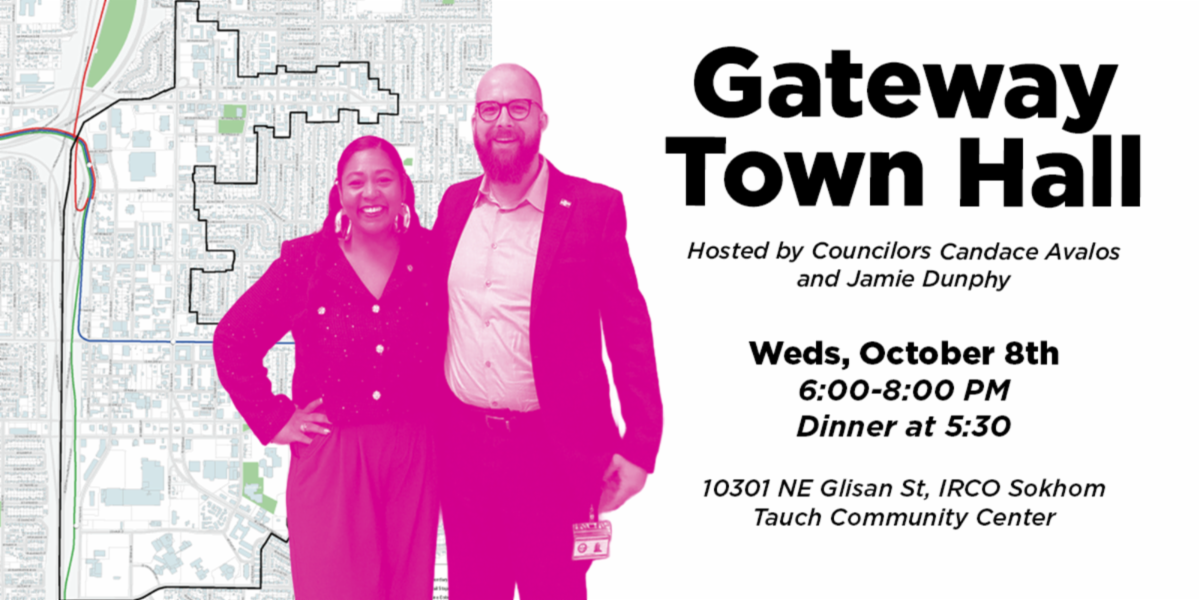 Councilor Avalos and Councilor Dunphy want to hear from Portlanders who live, work, and play in Gateway: What questions do you have about the plan for Gateway and what kind of investments do you want to see? In addition to the D1 councilors, there will be representatives from the City and community organizations to help answer questions. After a presentation from Prosper Portland, attendees will break into small discussion groups before sharing their thoughts with everyone.