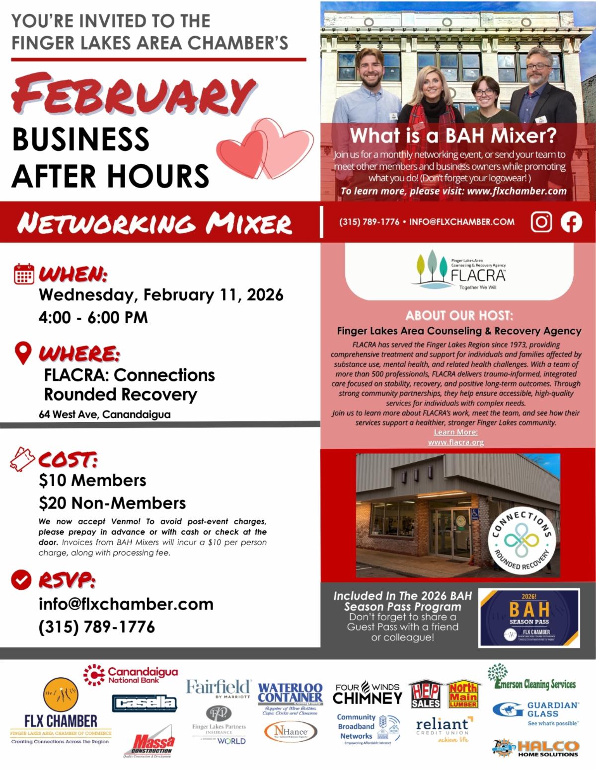 The FLX Chamber’s next Business After Hours Mixer will take place on Wednesday, February 11, from 4-6 pm at FLACRA: Connections Rounded Recovery, located at 64 West Ave, in Canandaigua. Spaces are limited. The cost to attend Business After Hours is $10 for Members and $20 for non-members, unless individuals have purchased a BAH Season Pass. This event is included for all 2026 Season Pass Holders, but reservations are still required. Please contact the Chamber via email at info@flxchamber.com or call 315-789-1776 for reservations or more information.