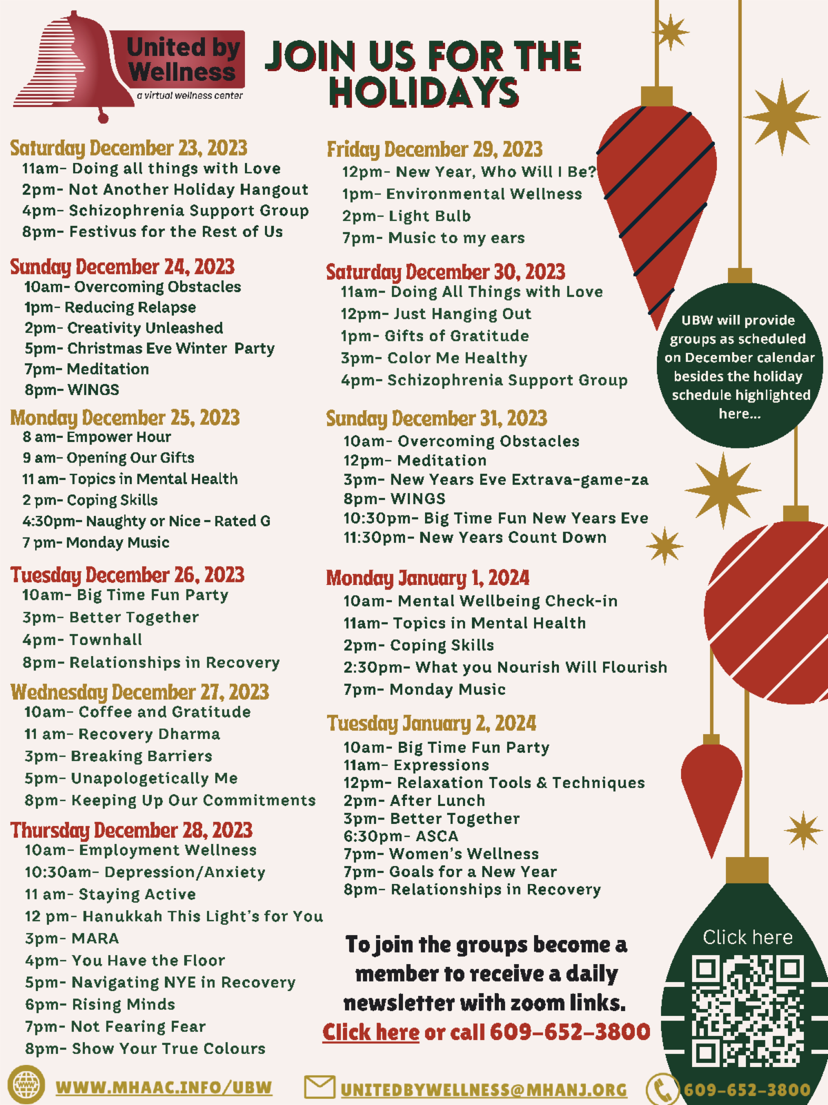 Here we offer you a wide range of support groups that do indeed meet over the holidays or have specialized holiday programming. One that is very notable is United by Wellness.