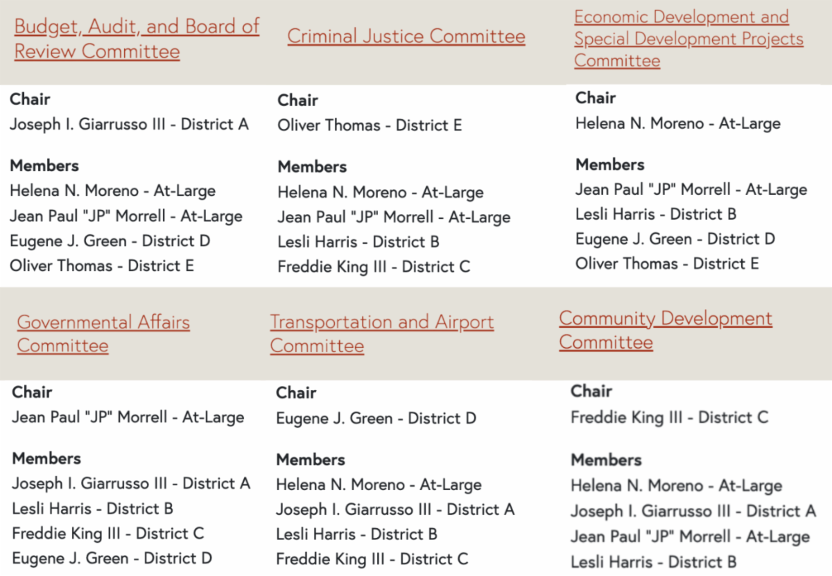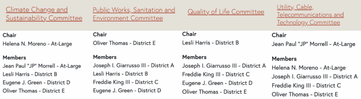 A new Council requires new standing committee chairs and members. Below is a list of each committee, the Councilmembers serving on that committee, and the respective chair. There is one additional standing committee this year: the Climate and Sustainability Committee, chaired by Council President Helena Moreno. |
