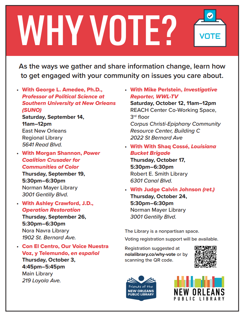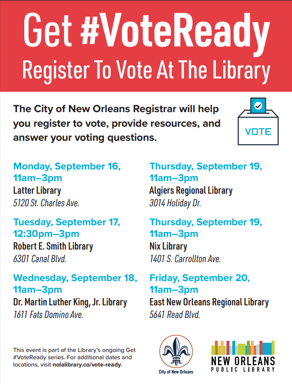 | | DEPARTMENT OF PARKS & PARKWAYS ACCEPTING APPLICATIONS FOR TREE PLANTING GRANTS | | NOLA 311 RELEASES CATCH BASIN REPORT FROM AUGUST 25 TO SEPTEMBER 8 | | SAFETY TIPS DURING POWER RESTORATION | | VOTING EVENTS AND REGISTRATION INFORMATION | |