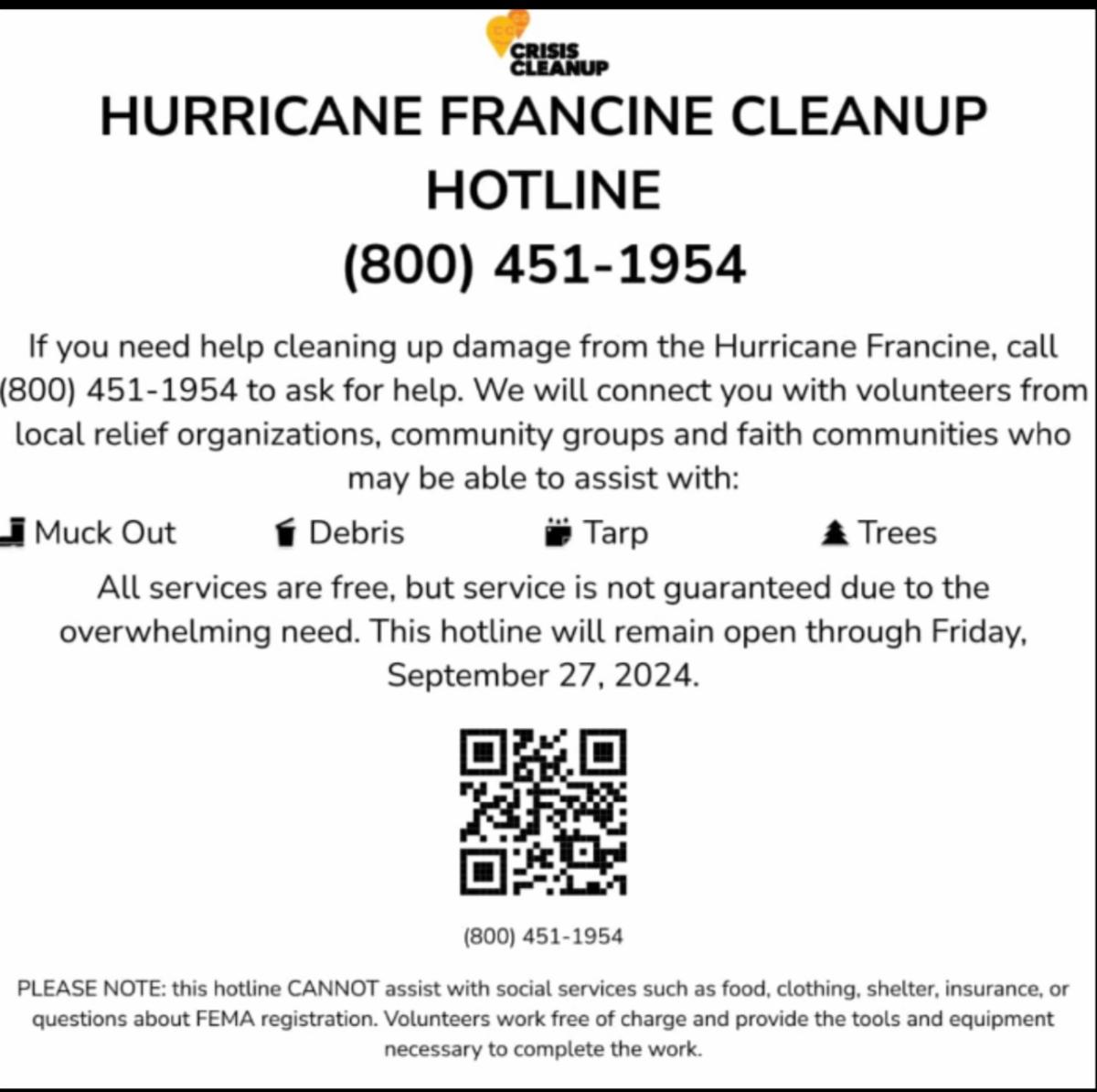 | | HURRICANE FRANCINE CLEANUP HOTLINE OPEN UNTIL SEPTEMBER 27 | |