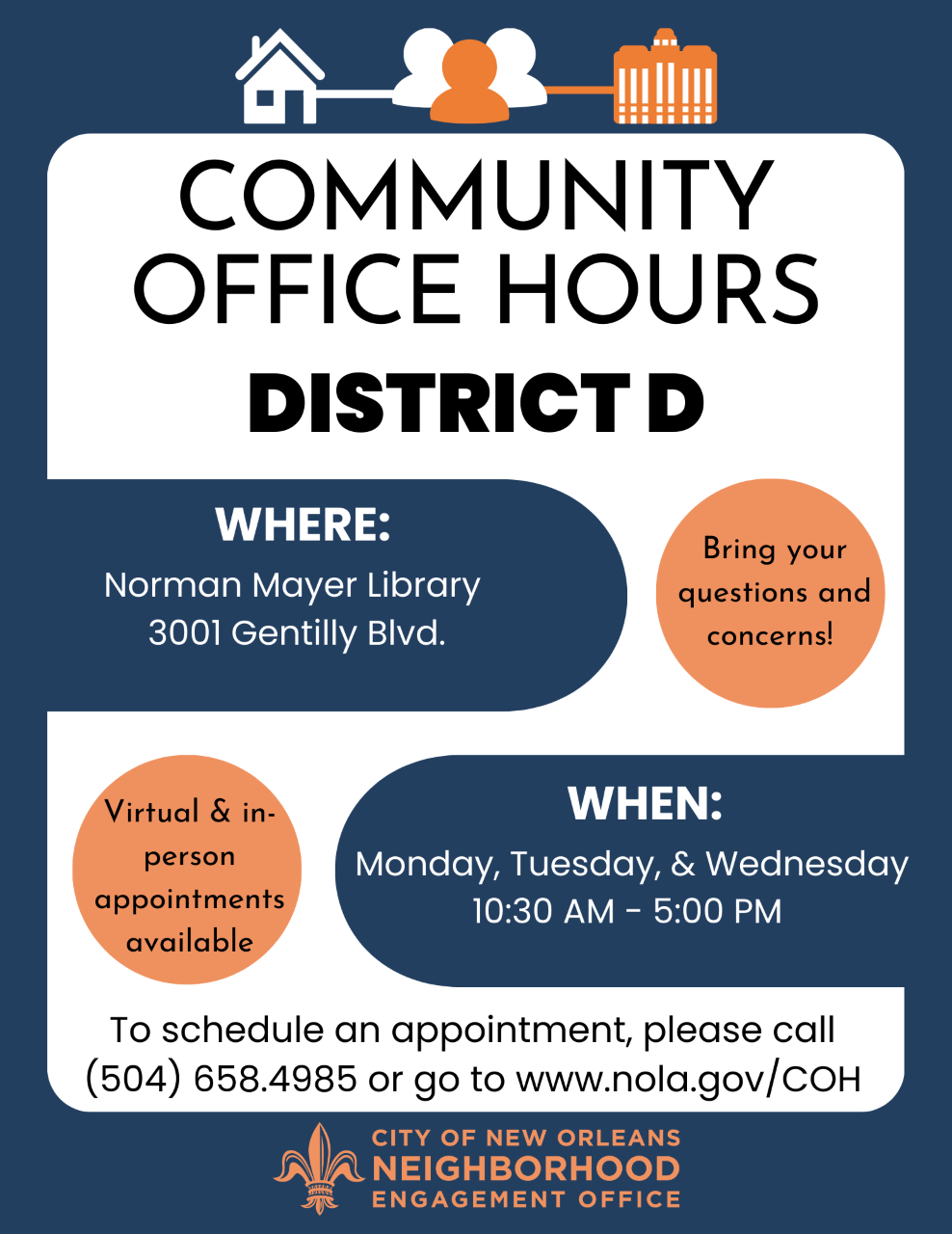 | | DISTRICT D COMMUNITY OFFICE HOURS AND RESOURCES | | GET IN TOUCH: NEW ORLEANS POLICE DEPARTMENT | |
