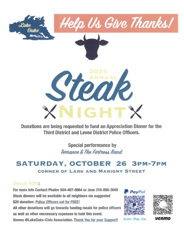 | | EMMETT W. BASHFUL SCHOLARSHIP GALA AND SILENT AUCTION BASH OCTOBER 25 | | DONATE: LAKE OAKS CIVIC ASSOCIATION'S ANNUAL STEAK NIGHT APPRECIATION DINNER FOR LAW ENFORCEMENT | | ONGOING EVENTS IN DISTRICT D | | NEW ORLEANS HEALTH DEPARTMENT HIGHLIGHTS FOOD SUPPORT IN THE CITY | |