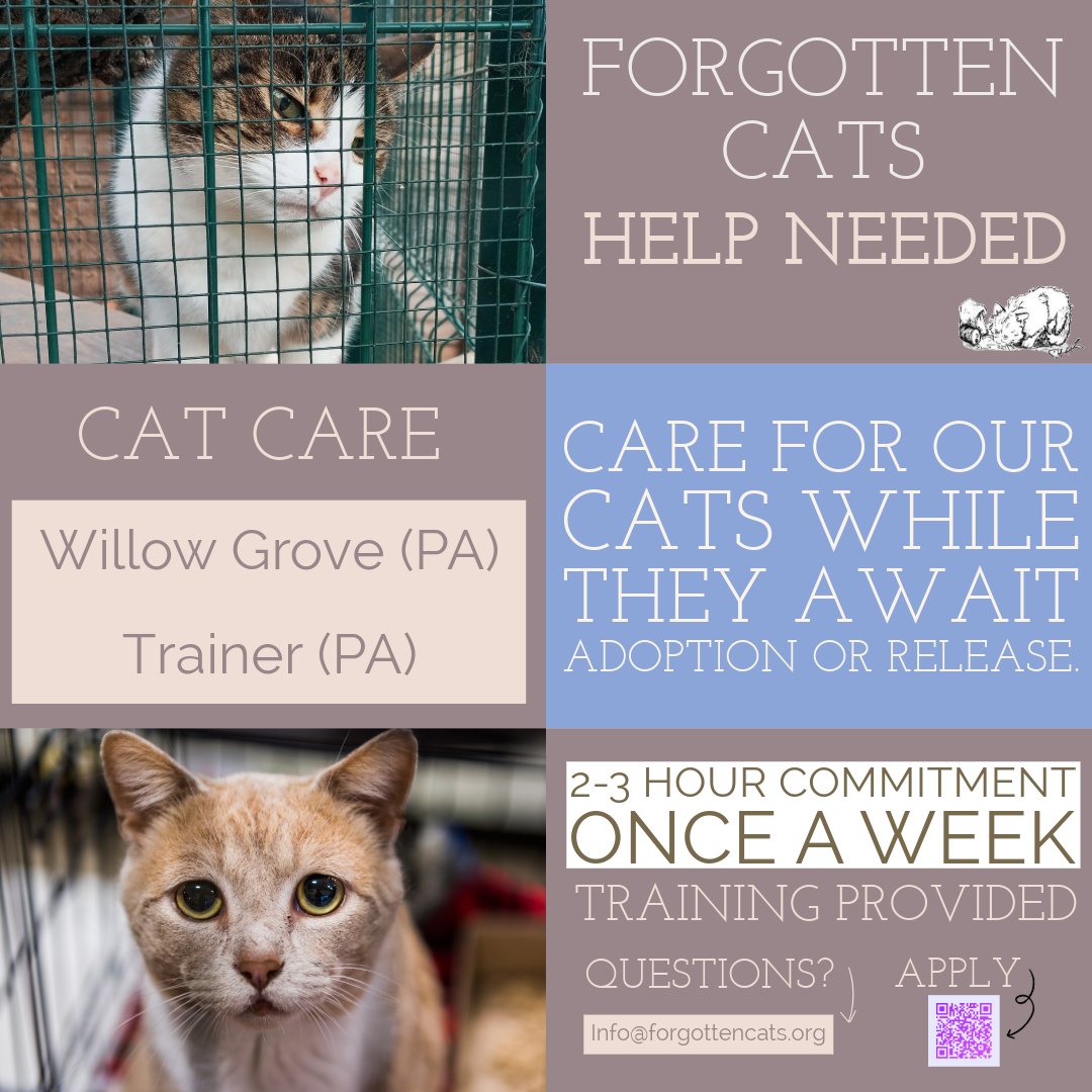 At Forgotten Cats, we are urgently seeking compassionate individuals to join our dedicated team as Clinic Volunteers at our Trainer Clinic located in Delaware County, PA, just a stone's throw from Claymont, DE.
