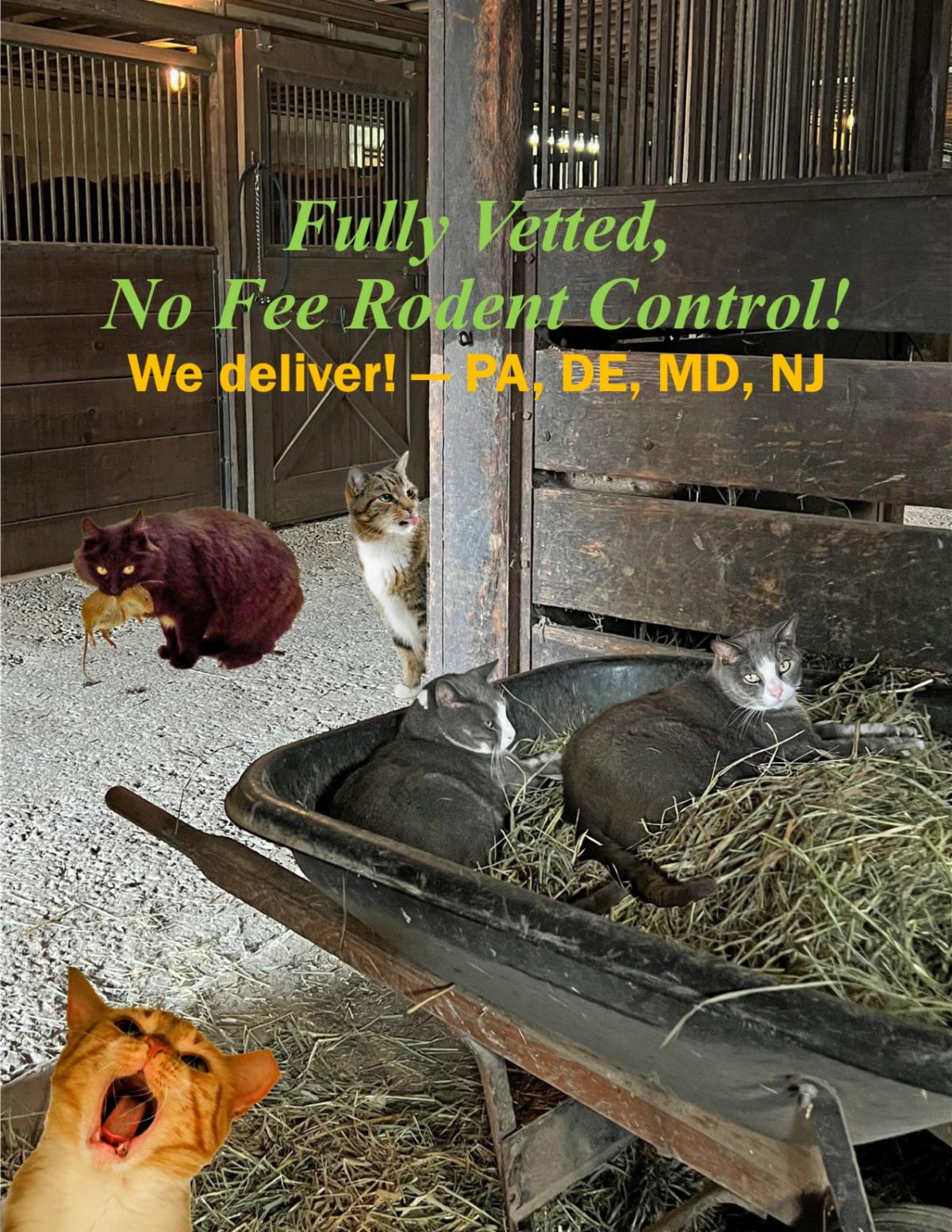 Forgotten Cats’ barn cats are spayed/neutered, vaccinated, dewormed and we’ll deliver them to PA, DE, NJ, MD properties FREE! Great for stables, farms and barns!