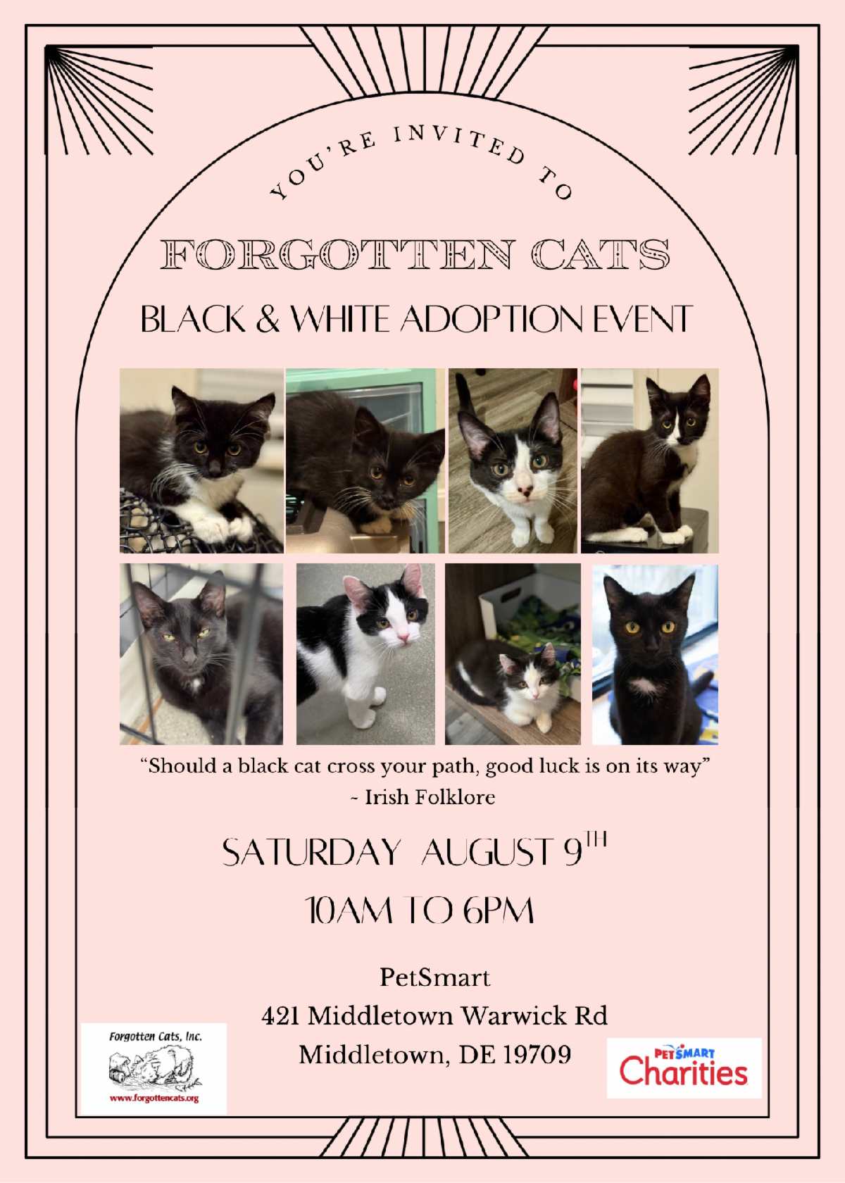 This Saturday, August 9, from 10:00 am to 6:00 pm, join us at the Middletown PetSmart Adoption Center for a heartwarming event featuring our delightful black and white cats and kittens!