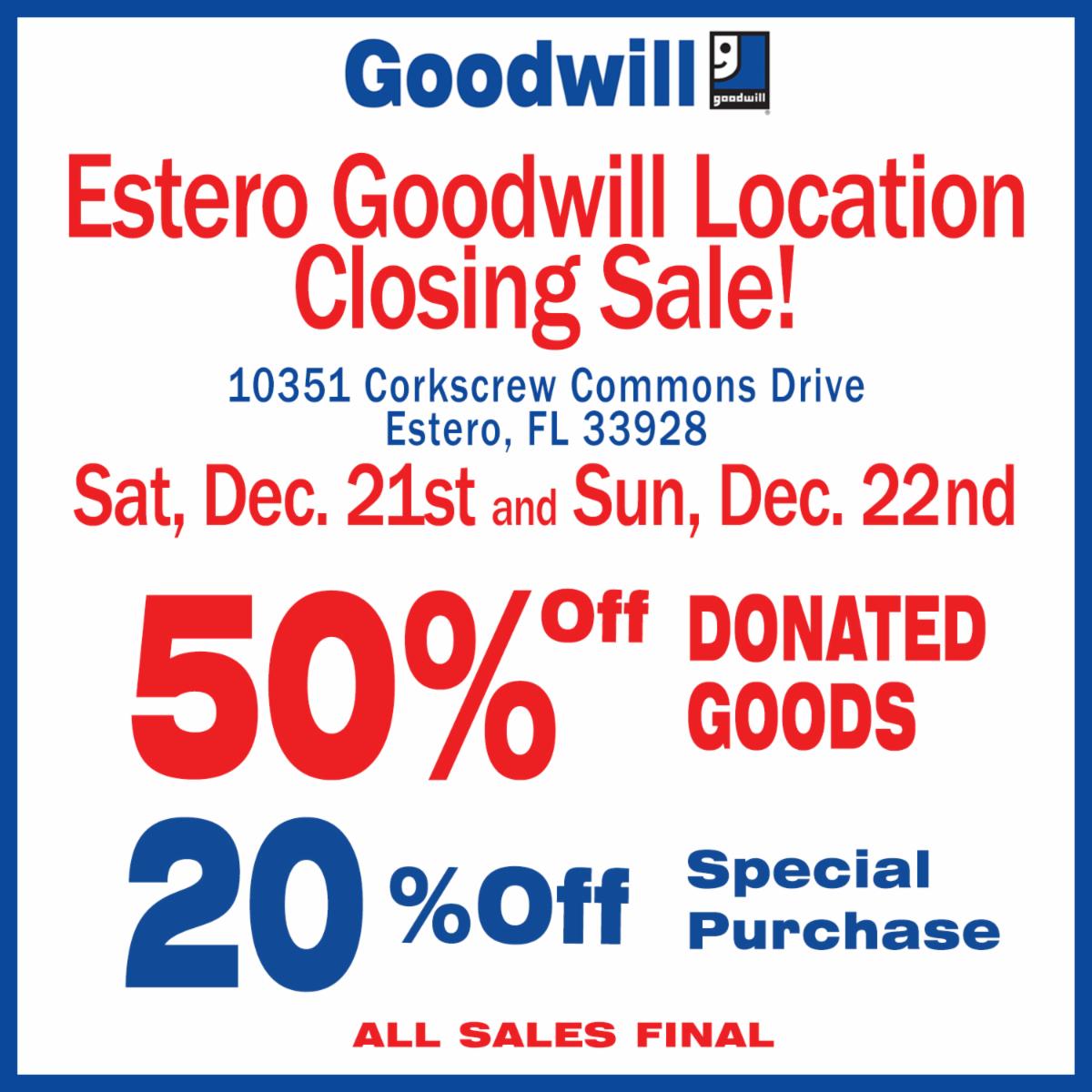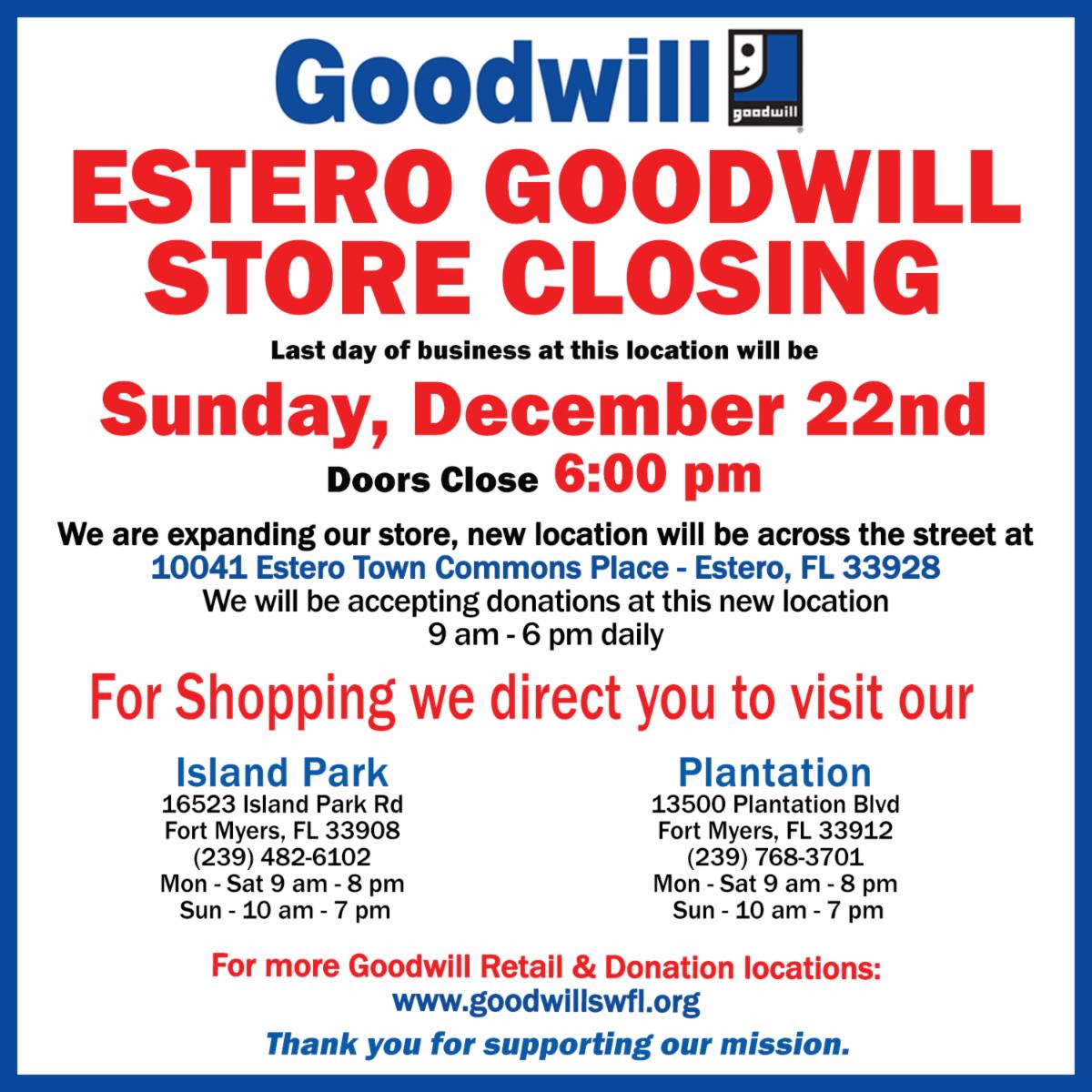 We are moving and closing the doors on the Estero Goodwill at 6pm on Sunday, Dec. 22nd.
