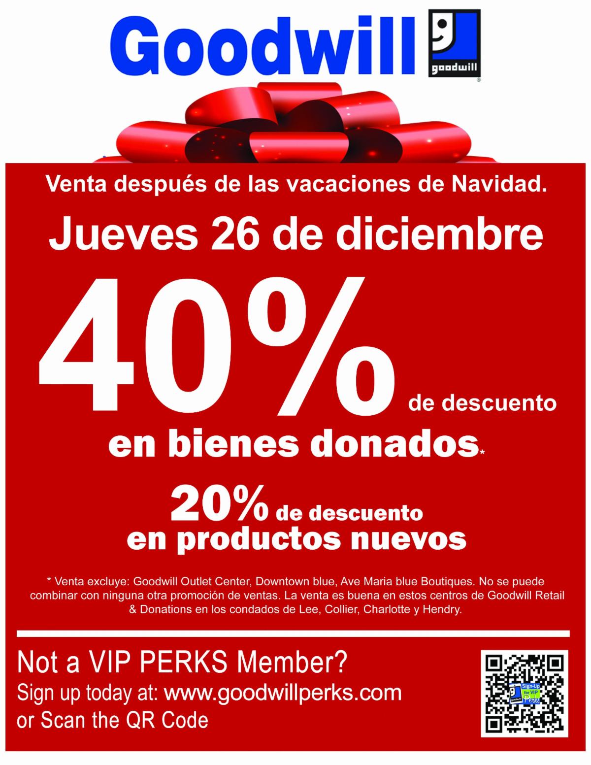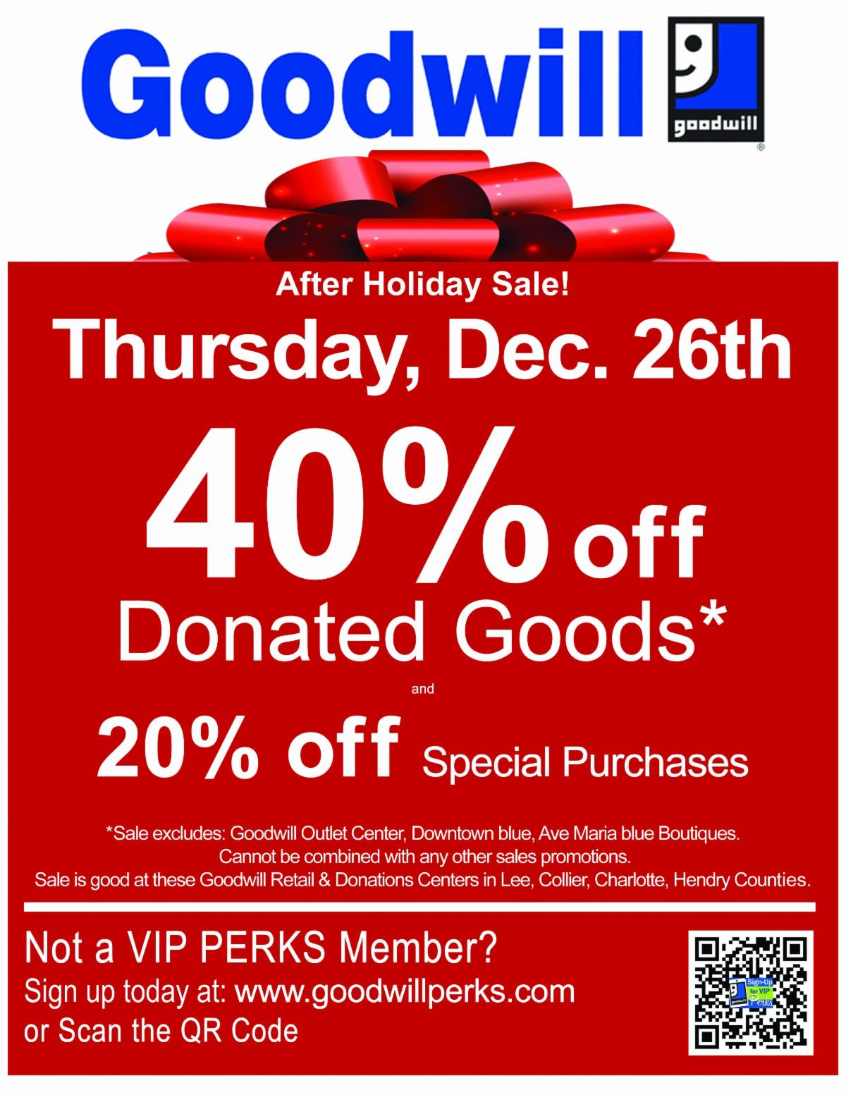 | | | Don't miss our After Christmas Sale! Take 40% off all donated and 20% off new good on Thursday, December 26th. Start the New Year with extra savings! | | Goodwill Industries of Southwest Florida, Inc. l (239) 995-2106 l email l website