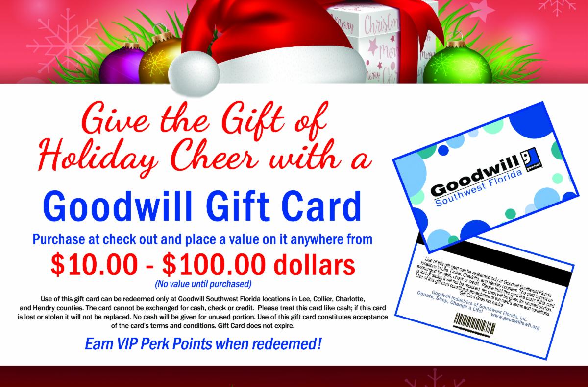 Gift the thrifter in your life the thrill of the hunt. Goodwill gift cards can be loaded with any amount from $10 to $100. They work just like cash at Goodwill stores, you earn VIP points when you use them, and they are refillable. Just ask the cashier to load a card on your next visit.
