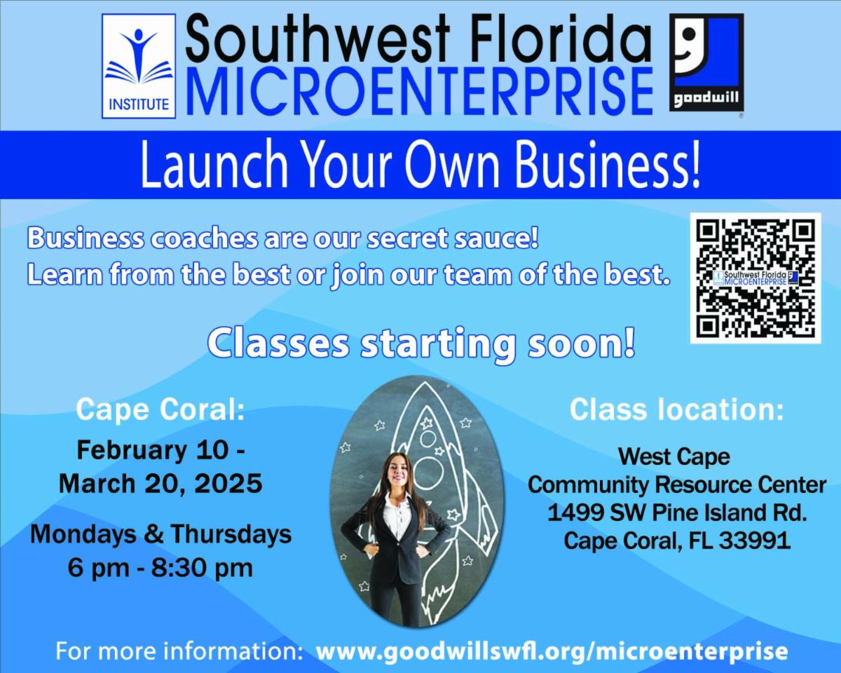 These small business classes are offered to residents of Charlotte (including North Port), Collier, Glades, Hendry, and Lee counties. For more information about upcoming classes, contact Sandra Plazas at sandraplazas@goodwillswfl.org, or call (239) 995-2106 Ext. 2304.