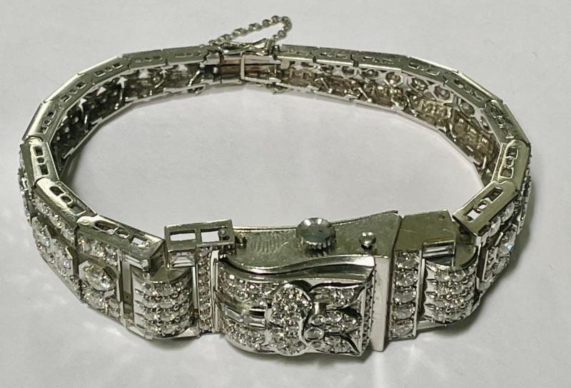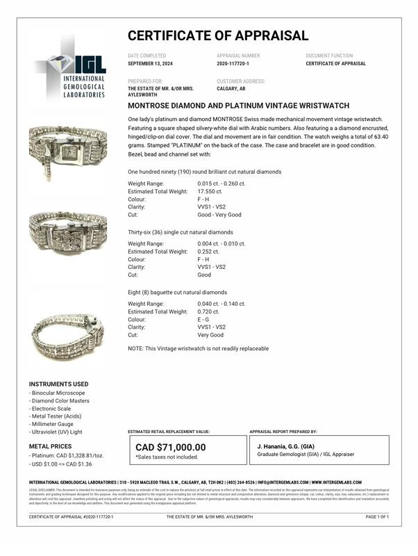 Ladies Platinum and diamond Montrose Swiss made mechanical movement vintage wristwatch. Featuring a square shaped silvery-white dial with Arabic numbers. Also featuring a diamond encrusted, hinged/clip-on dial cover. The bezel, bead and channel are set with 190 round brilliant cut natural diamonds, 36 single cut natural diamonds and 8 baguette cut natural diamonds.
