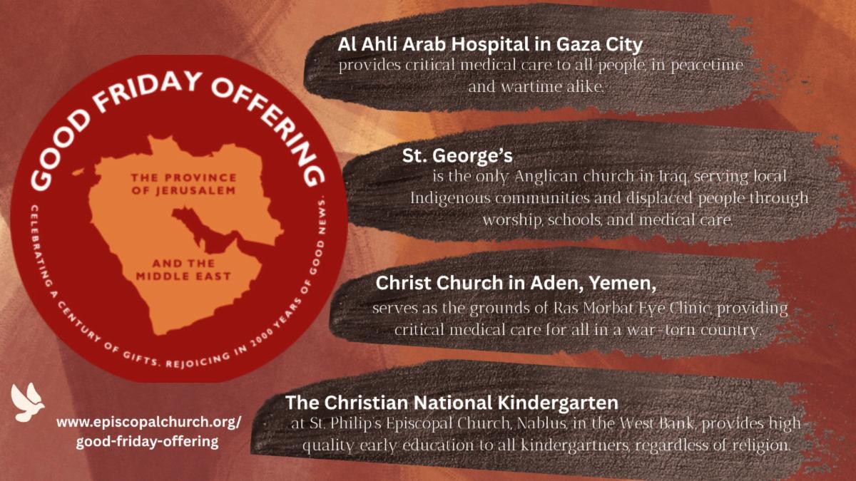 It is tempting to hear the Good Friday story and think that we would never do such a thing. We like to think that humanity has evolved, become more just, and our hardened hearts have become more open. But violence and the denial of humanity perpetuates even as we speak. For 103 years, the Episcopal Church has collected a Good Friday offering to raise awareness and funds for the Diocese of Jerusalem and the Middle East. On Palm Sunday this year, the Anglican run Al-Ahli Arab Hospital, the last fully functional hospital in Gaza City was hit by an Israeli air strike. As much as we want to look at the violence of the Good Friday where Jesus was killed as a single event, we must remember that violence continues every day in this world, and consider the ways in which we are implicated.