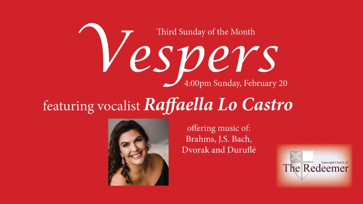 Join us today at 4pm for the monthly Vespers service. This month we are joined by parishioner and mezzo-soprano Raffaella Lo Castro who will offer works of Brahms, J. S. Bach, Dvorak and Duruflé. Raffaella is a Redeemer parishioner and performs regularly with regional opera companies and choral organizations.