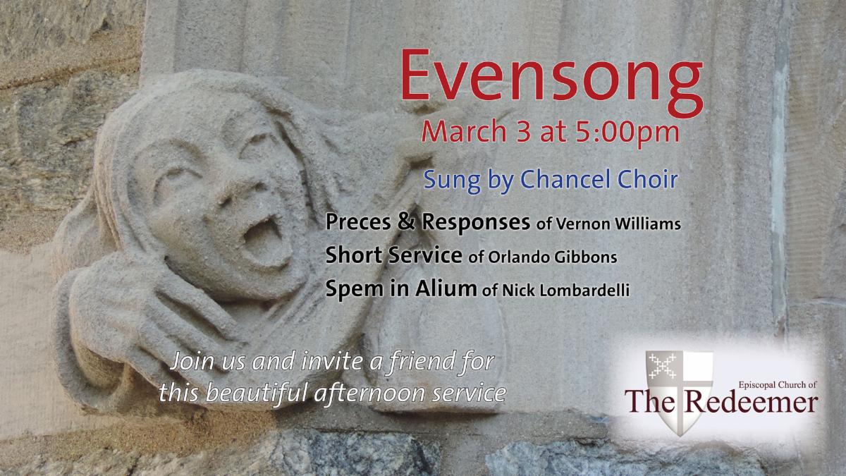 Service of Rite II Holy Eucharist with choirs You are invited to attend the service or view via livestream.   Click here for a copy of the PDF Liturgy for the March 3, 9:30am service.