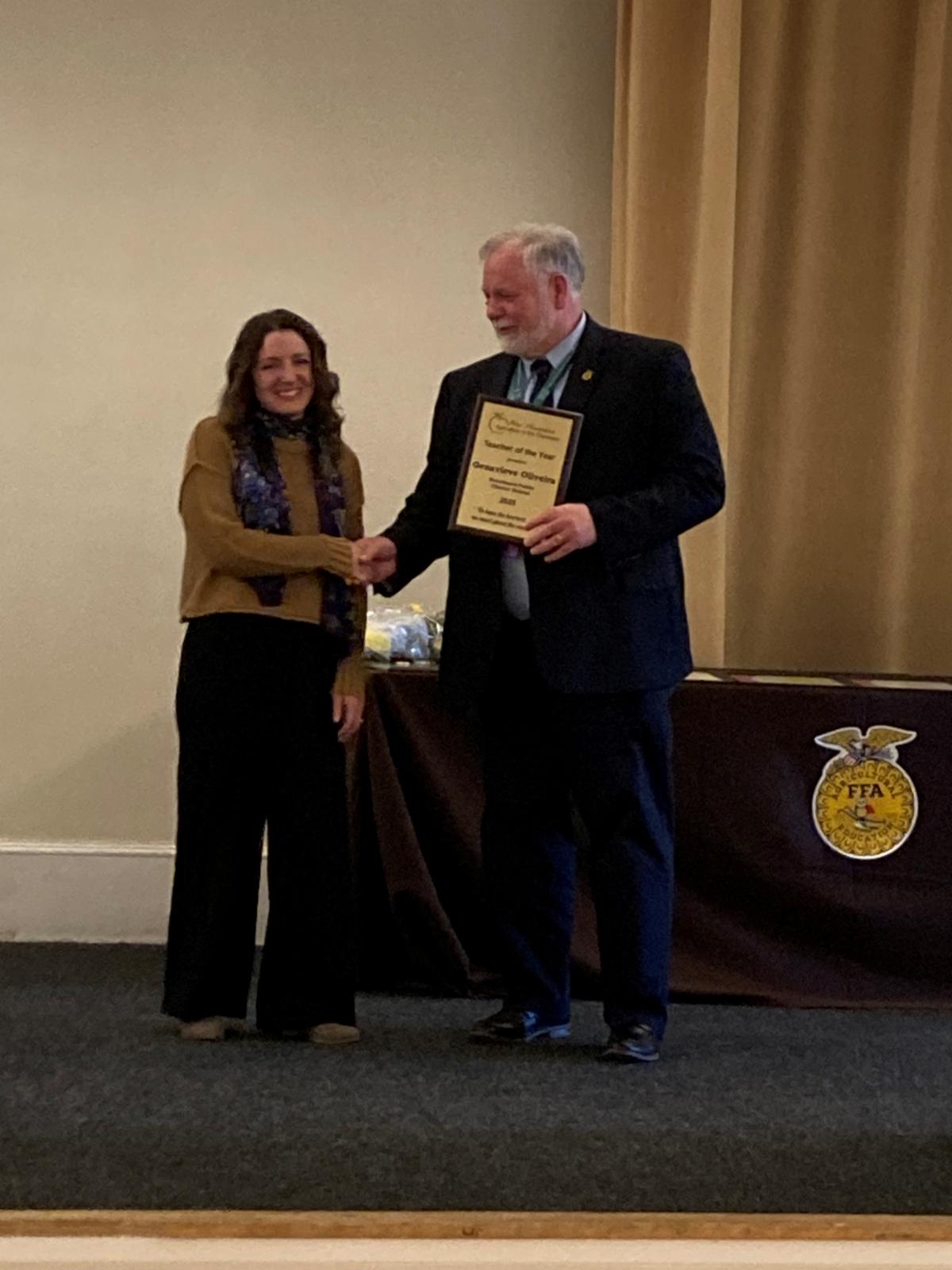 At the annual NH Future Farmers of America conference held last week at the Omni Mount Washington Hotel, 2025 NH Agriculture in the Classroom Teacher of the Year Genavieve Oliveira was recognized in an awards ceremony Thursday evening. She received recognition for her outstanding work at Heartwood Public Charter School in Jefferson, NH. Her endeavors with their school gardens, working to revitalize the existing ones while fostering new ones, along with rehabbing existing apple trees, working with vermiculture (worm composting) along with using a variety of experts and field trips to enhance her students experiences in agriculture all add to her student's understanding of the world around them and how agriculture affects their lives.