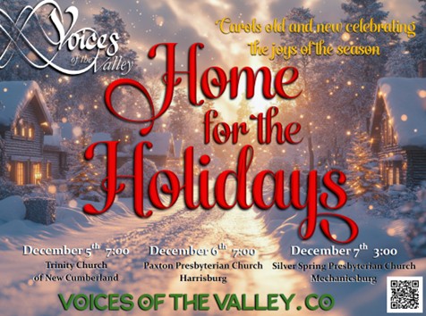 They're back! Voices of the Valley is returning to Silver Spring Presbyterian with a concert on Sunday, December 7th at 3:00 pm. The Choir, formerly the Lebanon Valley College Alumni Choir, includes SSPC's own Jim & Carol Anderson, Ken Harm and Lucy Vaughan. The Concert is free and open to the public. Join us for Home for the Holidays,,,,Carols old and new celebrating the joys of the season!