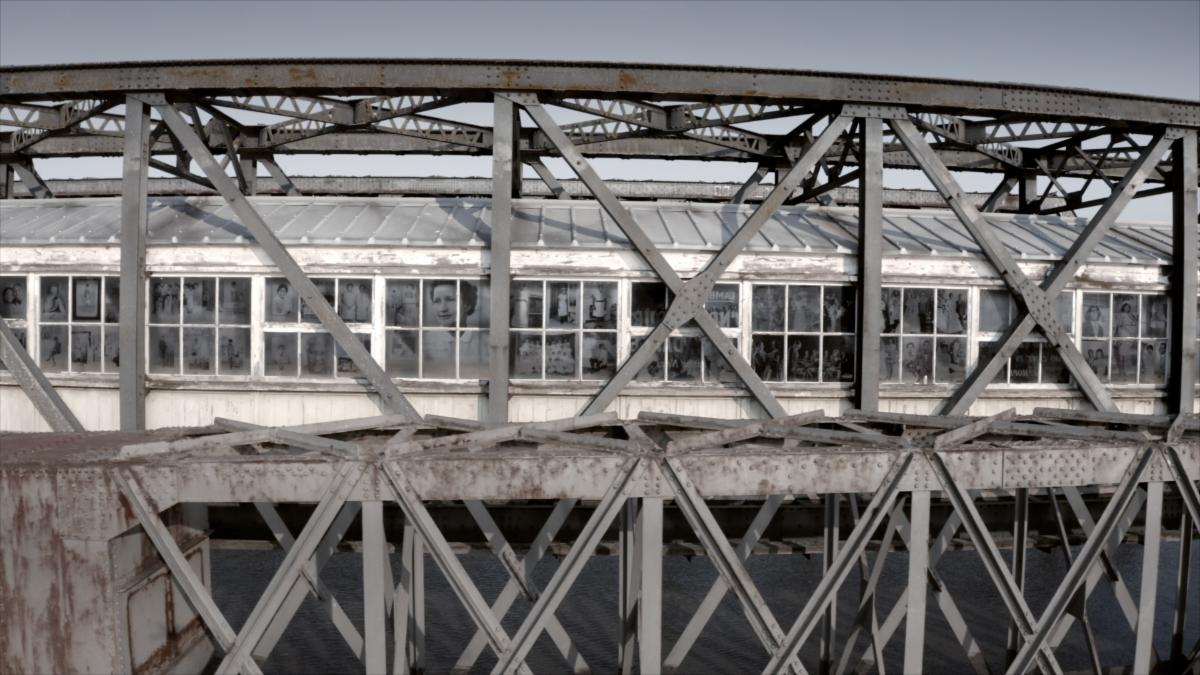 © EVEWRIGHT. Film Still Top: A window panel featuring John Tyndall founder of the White Defence League at Tilbury Bridge Walkway of Memories.